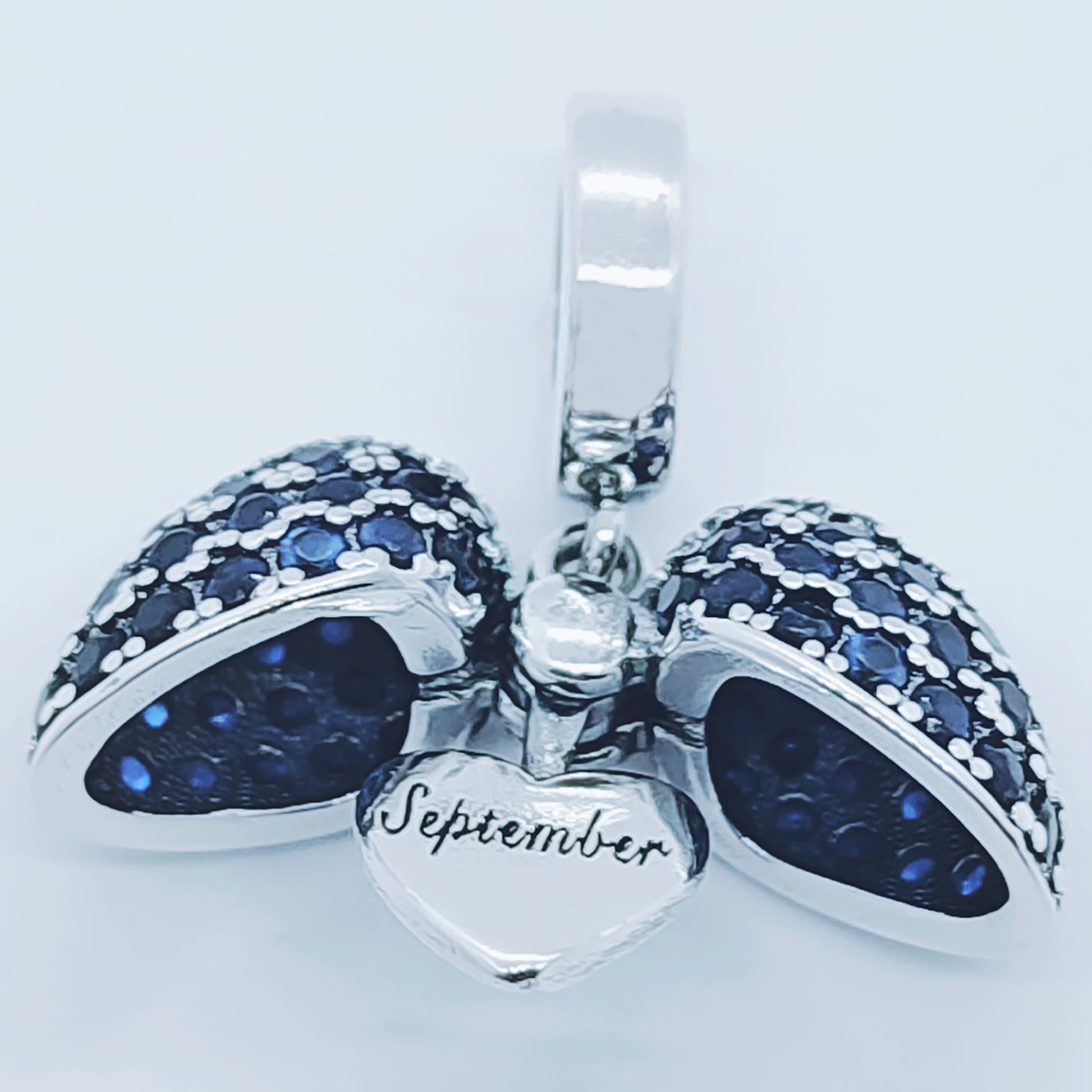 Birthstone Sapphire crystal sterling silver heart locket. Reveals a silver heart inside engraved with month on both sides.